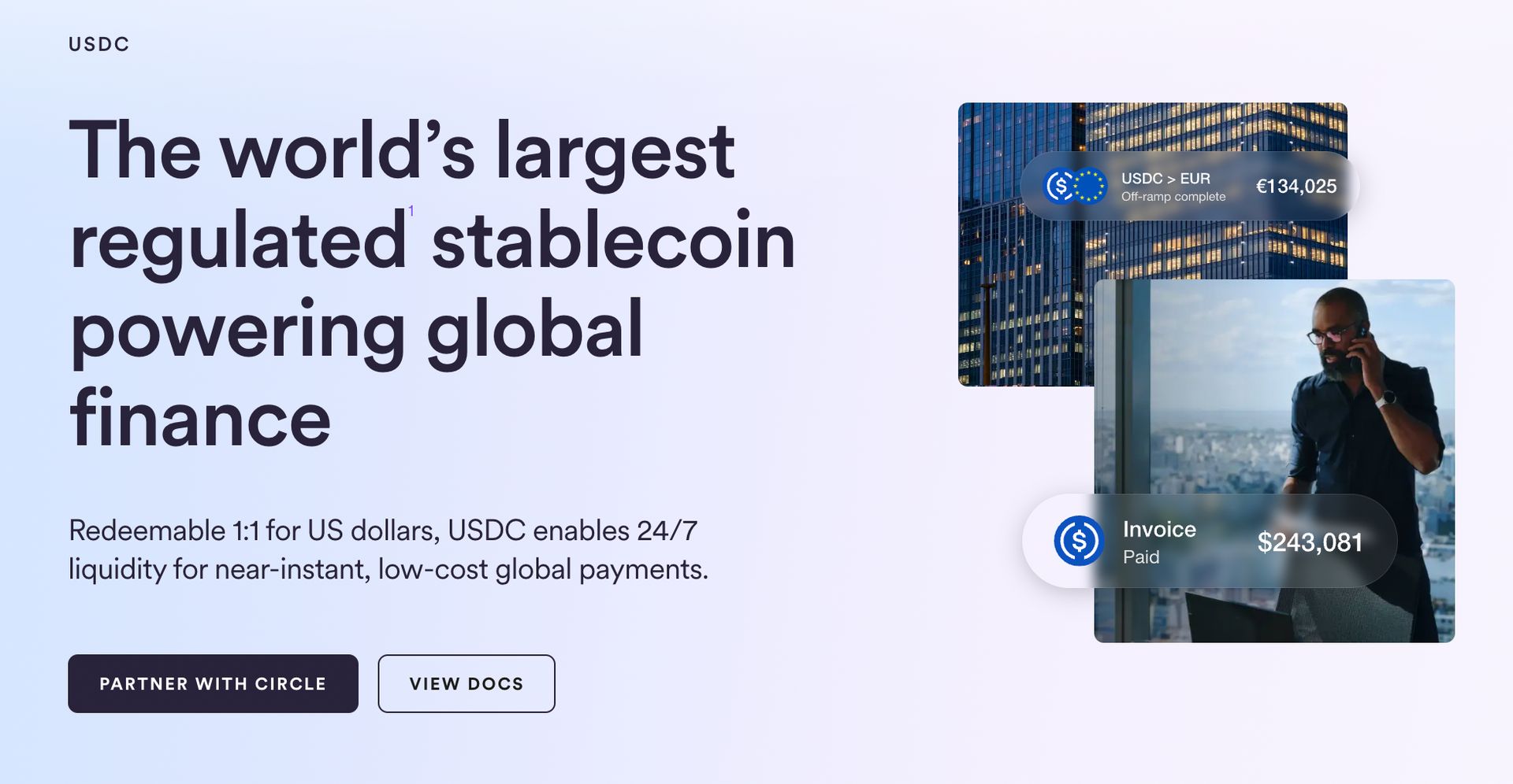 "Built for rapid global payments and 24/7 financial markets, USDC is a regulated digital currency that is redeemable 1:1 for US dollars."