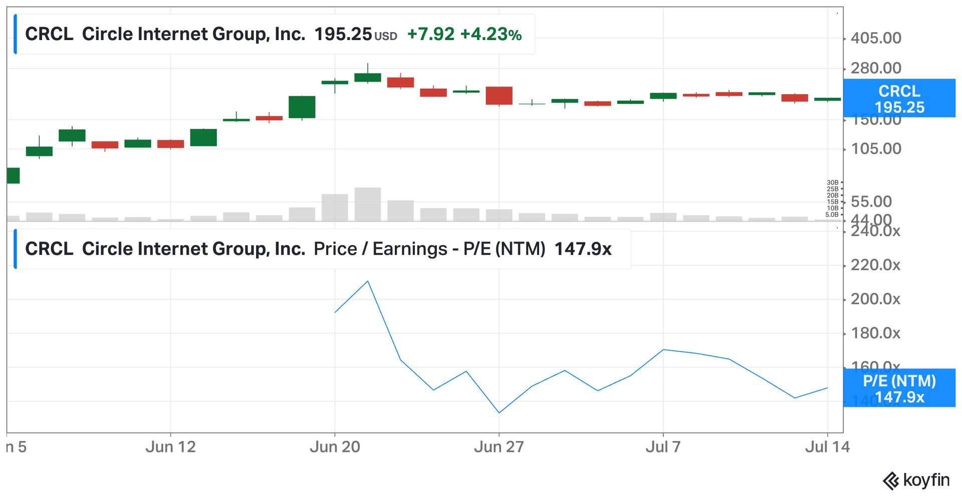 So why are investors willing to pay a 147 P/E for Circle stock?! Circle priced its IPO at $31 per share, and the stock briefly approached $300 before settling around $195.